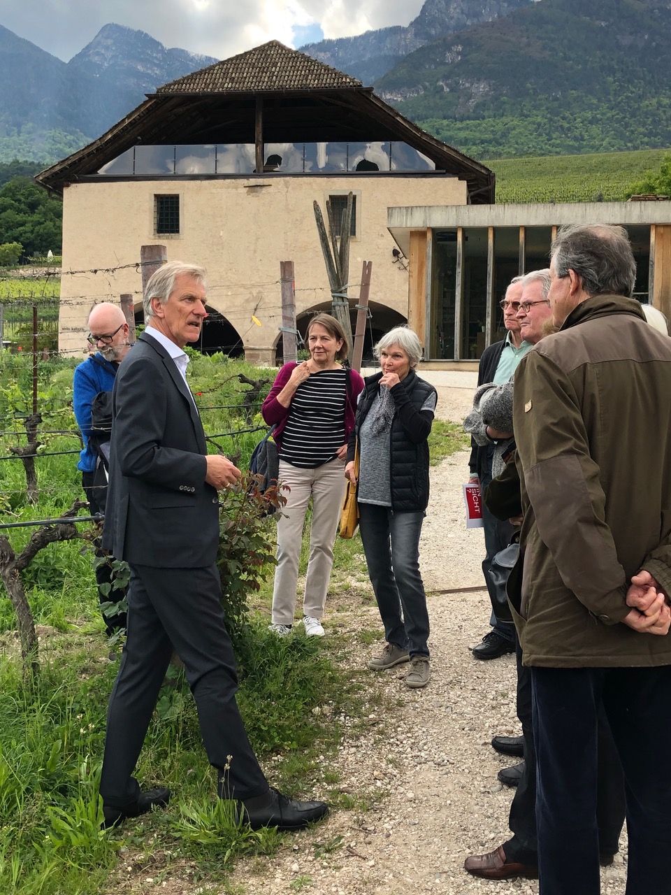 In unseren drei Tagen bekamen wir Einblicke in eben dieses H2-Zentrum, die Winzergenossenschaften Tramin, Meran-Burggräfler und Kaltern sowie die Einzelwinzer und Obstbauern Josephus Mayr (Erbhof Unterganzner) und Michael Graf Goess-Enzenberg (Manincor). Dabei durfte von uns natürlich nicht außer Acht gelassen werden, dass gerade bei den Weinbaubetrieben in den letzten Jahren ein enormer technischer und gestalterischer Aufwand betrieben wurde, um eine Qualitätssteigerung zu erbringen, die den Weinskandal von 1985 vergessen machen sollte, gleichzeitig aber auch um mit einer positiven Außendarstellung zu werben. Hier fielen Architektennamen wie feld72 aus Wien, Walter Angonese und v.a. Werner Tscholl.