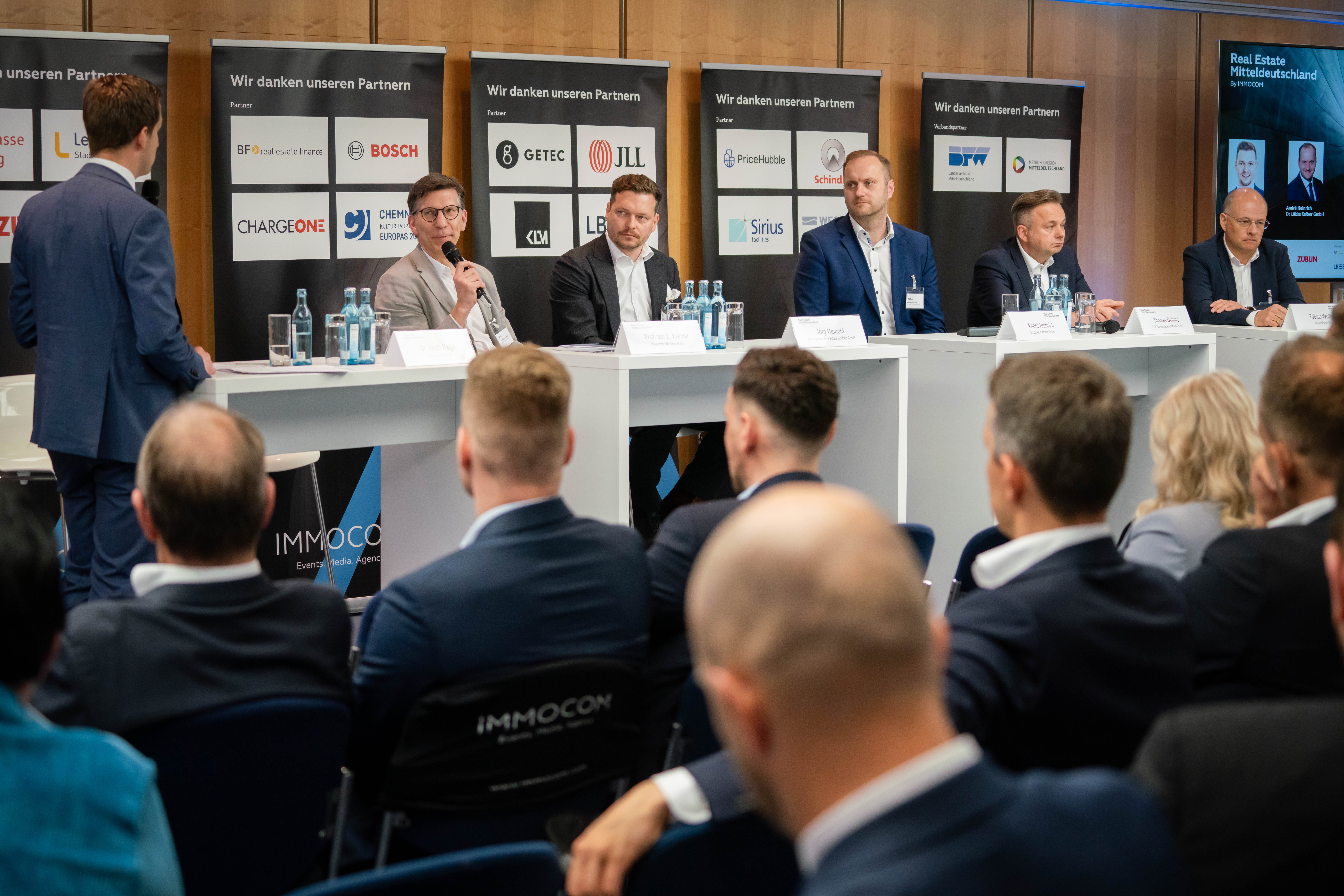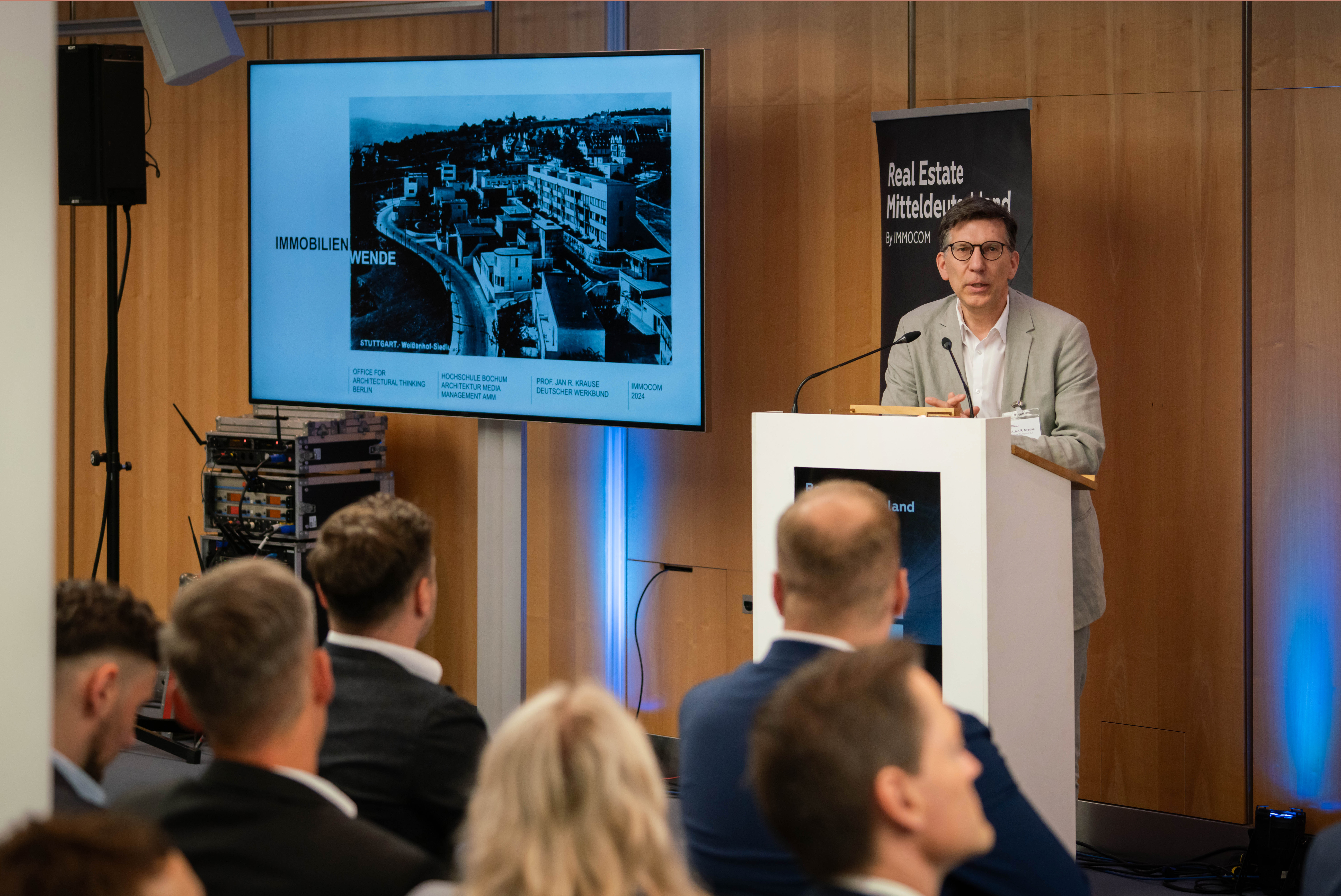 Auf der Leipziger Immobilien-Fachmesse „Real Estate Mitteldeutschland“ sprach DWB-Bundesvorsitzender Jan R. Krause im Mai 2024 zur Zeitenwende im Immobilienmarkt. Unter dem Titel „Wohnen, Retail, Invest: Weiterdenken als survive until 25“ diskutierte er mit Jörg Heinold (BNP), André Heinrich (Dr. Lübke & Kelber), Thomas Oehme (ECE) und Tobias Wolfrum (jenawohnen) über die aktuellen und zukünftigen städtebaulichen Herausforderungen mitteldeutscher Städte wie Leipzig, Dresden und Jena. Krause erörterte die Haltung des Deutschen Werkbunds und plädierte für gemischte Wohnquartiere, sozialen Zusammenhalt und eine neue Wertschätzung des Bestands. Besonderes Interesse fanden die Werkbund-Initiativen verschiedener Landeswerkbünde für Vielfalt und Zusammenhalt im ländlichen Raum. Das von Dr. Ulrich Nagel (UNA Immobilien-PR) moderierte Panel endete mit einem vorsichtig optimistischen Ausblick auf eine stabile Entwicklung in der Region und zugleich mit einem gewissen Unbehagen angesichts der möglichen Folgen der bevorstehenden Wahlen im September.