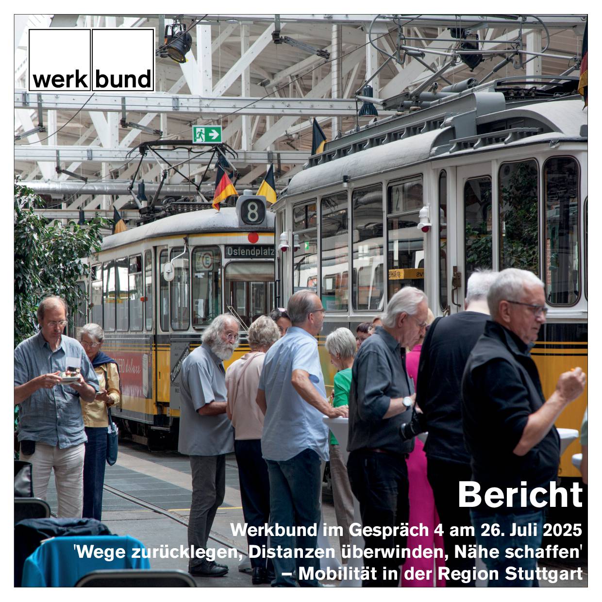 Die Stadtgruppe Stuttgart des Deutschen Werkbund Baden-Württemberg hat am 26.07.2025 zur vierten Veranstaltung „Werkbund im Gespräch“ nach Stuttgart eingeladen. Anlass ist der 23. Juli 2025, der Tag, an dem sich die Eröffnung der Werkbundausstellung „Die Wohnung“ in Stuttgart zum 98. Mal jährt. Treffpunkt für die Veranstaltung unter der Überschrift „Wege zurücklegen, Distanzen überwinden, Nähe schaffen – Mobilität in der Region Stuttgart“ war in diesem Jahr das Straßenbahnmuseum Stuttgart der SSB in Bad Cannstatt.