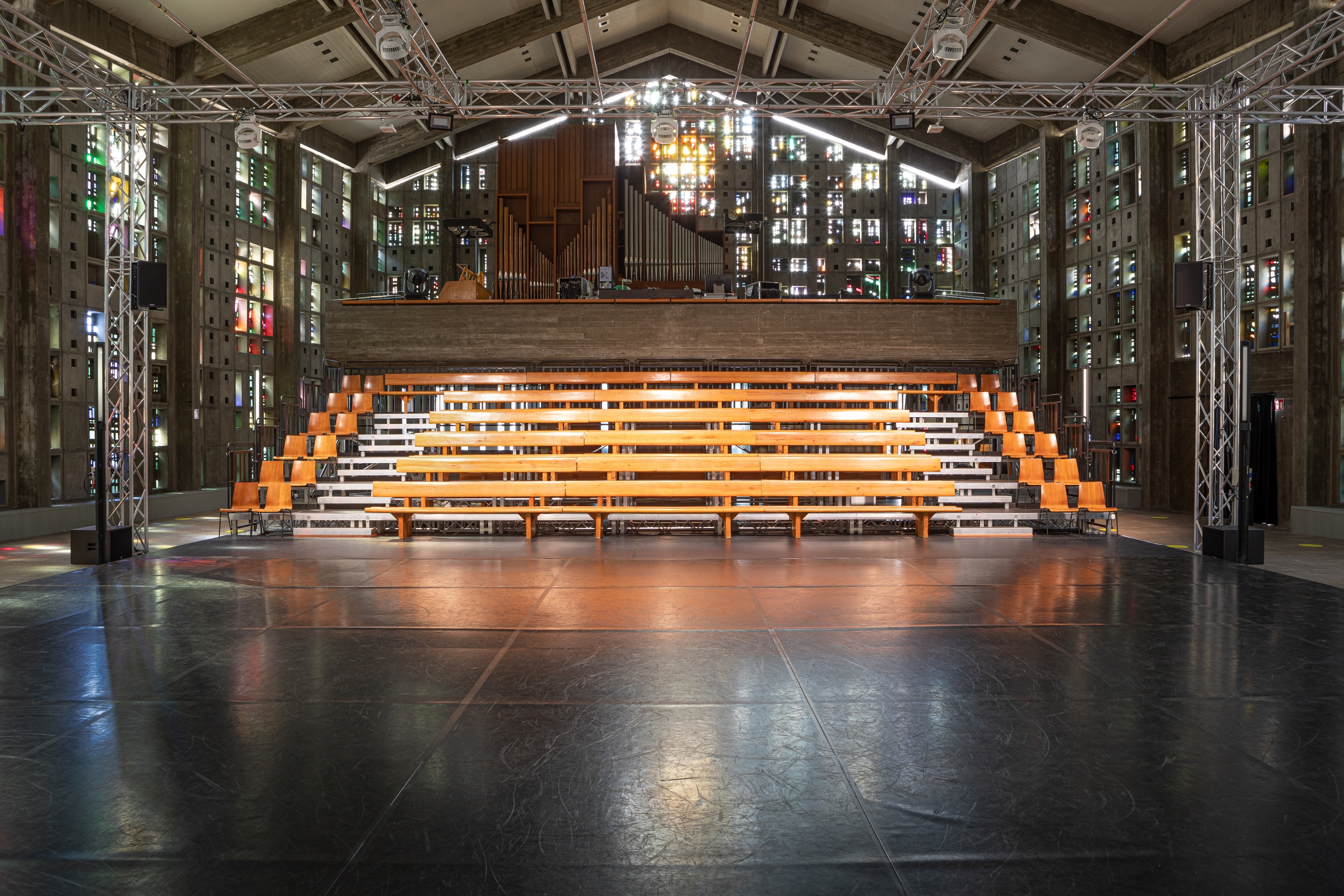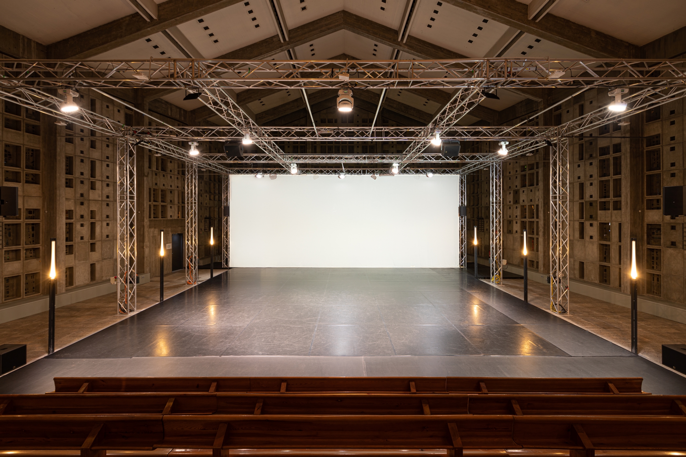 Die Gründung der Spielstätte wurde ermöglicht durch die Zusammenarbeit von unterschiedlichen Akteur*innen aus Kunst, Kirche und Stadt. Die in die Trinitatiskirche eingebaute Theaterarchitektur ermöglicht eine direkte Begegnung zwischen Kunst und Betrachter*innen. Die Geschichte des Gebäudes und dessen Ursprung als Kirchenraum ist in der denkmalgeschützten Architektur von Helmut Striffler weithin spürbar und schafft eine einzigartige Atmosphäre für die künstlerische Produktion. Die Beton-Glas-Architektur, die dem Brutalismus zugeordnet wird, gibt einen außergewöhnlichen Rahmen sowohl für das Kunstschaffen als auch für das Kunstbetrachten. Teile der Kirchengeschichte – wie die Kirchenbänke aus Holz – wurden in das Theater integriert und lassen die Geschichte des Hauses bis heute spürbar werden.