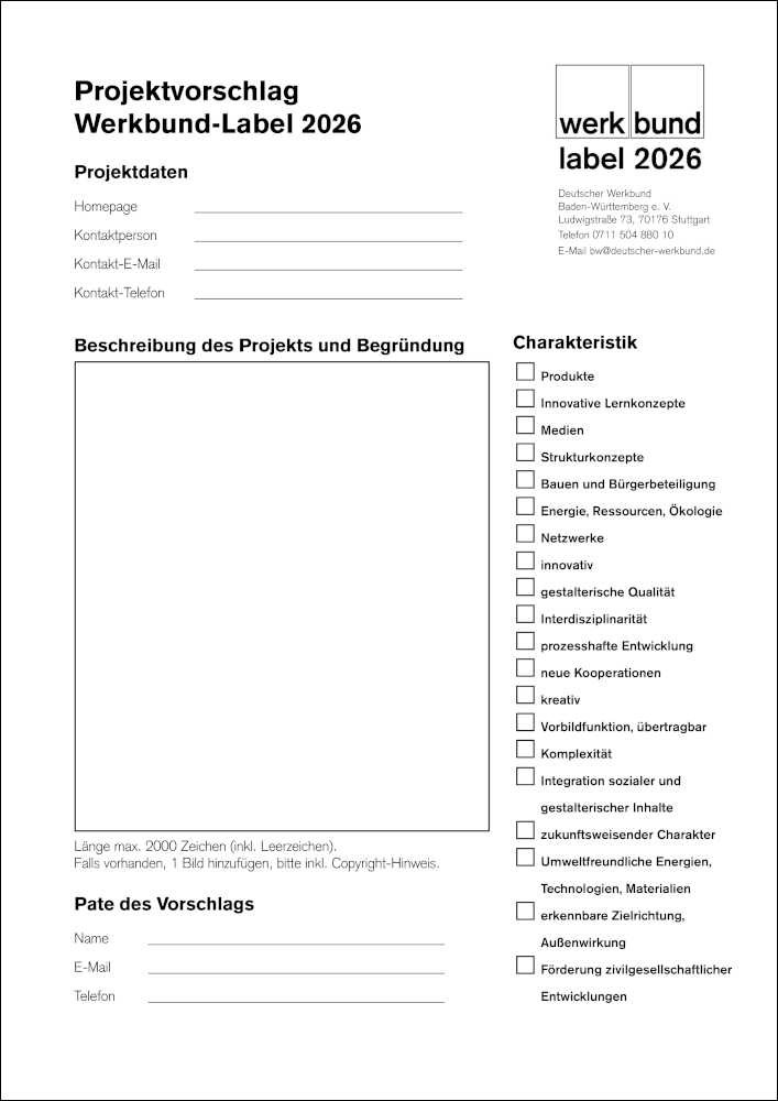 Zum Einreichen muss das entsprechende Formblatt (siehe PDF-Download unten) ausgefüllt und an die Geschäftsstelle des Deutschen Werkbunds Baden-Württemberg per E-Mail an bw@deutscher-werkbund.de geschickt werden.